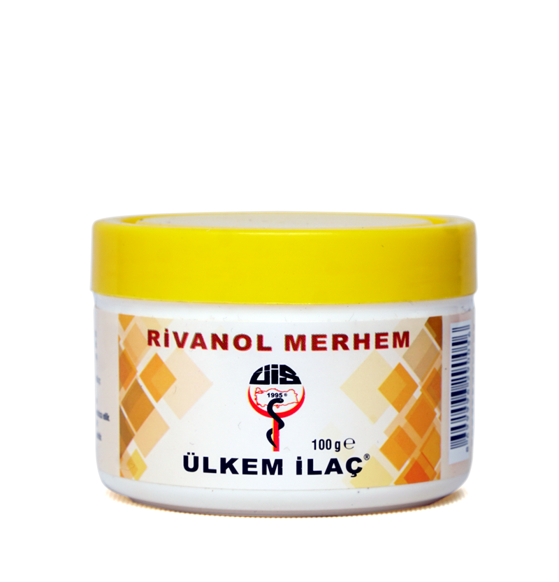 BİLEŞİMİ100 gramlık kutu içinde 0.2 g Rivanol 99.8 g Vazelin içeren , Sarımsı renkli kokusuzdur. KULLANIM ŞEKLİ VE DOZU Ülkem rivanol merhem kullanılmadan önce tatbik edilecek bölge sabun ve su ile yıkanmalı ve kurulanmalıdır. 3-4 gün süre ile ince bir tabaka halinde tatbik edilir. Gerektiğinde tekrar edilir.Kedi , köpek , at, küçük ve büyük baş hayvanlar için. Tedaviye yardımcı olarak kullanılır.FARMAKOLOJİK ÖZELLİKLERİÜlkem rivanol merhem deri bakım ürünüdür. Tedaviye yardımcı olarak kullanılır sarı renkli akridin boyadır. Bakteri DNA’sına bağlanarak etki eder.Hassas ve hasarlı deriyi dış etkenlerden korur. Kuru ve çatlak cildin üzerini kaplayarak yumuşamasını sağlar.İrin, kan ve serum gibi organik maddelerin bulunduğu ortamda da etkilidir.Hafif cilt tahrişlerinde, cilt döküntülerinde, cilt ve meme çatlaklarında ve yaralarında koruyucu yüzey oluşturarak iyleşmeyi hızlandırmada yardımcı olur.MUHAFAZA ŞARTLARI VE RAF ÖMRÜOda ısısında, ışıktan ve rutubetten uzakta , çocukların ulaşamayacağı yerde muhafaza edilmelidir. Raf ömrü imal tarihinden itibaren 2 yıldır.