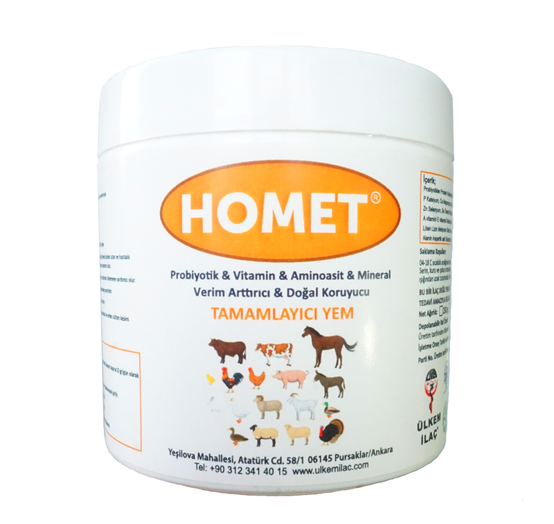 HOMETProbiyotik & Vitamin & Aminoasit & Mineral Verim Arttırıcı & Doğal Koruyucu Yem Katkı MaddesiKULLANIM ŞEKLİ VE DOZAJI:*Buzağılarda mama veya sütle karıştırılarak hayvan başına 5 gr/gün olarak*Süt ve besi sığırlarında 25 gr/gün*Hastalık ve stres hallerinde 40 gr su ile çalkalanarak içirilir.*Atlarda 15 gr/gün Taylarda 10 gr/gün*Kedi ve köpeklerde 1 çay kaşığı/günKULLANIM AMACI:Kanatlılarda, küçük ve büyükbaş hayvan yemlerinde*Sindirim sistemini düzenler,*Bağışıklık sistemini güçlendirir,*Hastalılara karşı korunmaya yardımcı olur,*İshal-Asidoz ve Typani (gazlı şişkinlikleri) önler*Mide bağırsak florasını devamlı fizyolojik ahenk içinde tutar ve hastalık yapıcı bakterilerin üremesini engellemeye yardımcı olur.*Yemden yararlanmayı arttırarak, çiğ yem atılımını önlemeye yardımcı olur.*Enterobakteriyellerin üremesini engellemede yararlıdır.*Et, süt, yumurta, döl verimini ve iştahı arttırır.*Kuzu ve buzağıların işkembelerinin gelişmesini ve erken sütten kesimi sağlamak amacıyla kullanılır.*Hastalıklardan ve stresten korumaya yardımcı olur.*Kanatlılarda ton yeme 0,5 kg katılarak kullanılır. Zorlu koşullarda 1,5 kgSaklama Koşulları:04-18 C sıcaklık aralığında saklayınız. Serin, kuru ve ışıksız ortamlarda saklanmalıdır. Direk güneş ışığından uzak tutulmalıdır. Ürünün ambalaj ağzı kapalı tutulmalıdır.