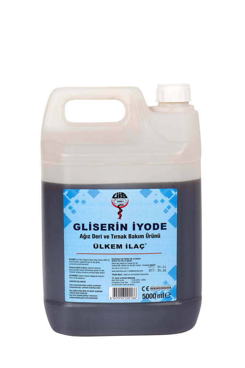 BİLEŞİMİ 5 kiloluk plastik bidon içinde 50 g İyot 25 g potasyum iyodür 4925 g Gliserin içerir.Kırmızımsı kahve renkli dir.KULLANIM ŞEKLİ VE DOZUÜlkem gliserin iyode Ağız deri ve tırnak bakım çözeltisi. Kedi , köpek , at, küçük ve büyük baş hayvanlar için Günde 3-4 kez problemli bölgelerin çözülmesinde yardımcı olur iyileşme oluncaya kadar sürülür.FARMAKOLOJİK ÖZELLİKLERİGliserin iyode Diş eti ile , ağız ve deri yaralarında tedaviye yardımcı olarak kullanılır.İyot, bakteri, virüs ve mantarlara, etkili yoğunluklarda da. Etkisini mikroorganizmaların içine nüfus ederek hayati metabolik reaksiyonları etkiler ve tedaviye yardımcı olur. Taşıt madde olarak nemlendirici ve yumuşatıcı özelliklere sahip gliserin kullanıldığından ağız ve mukoza antisepsisinde tedaviye yardımcı olarak kullanılır. MUHAVAZA ŞARTLARI VE RAF ÖMRÜOda ısısında, ışıktan ve rutubetten uzakta , çocukların ulaşamayacağı yerde muhafaza edilmelidir. Raf ömrü imal tarihinden itibaren 2 yıldır.