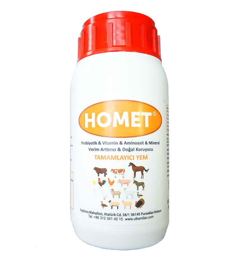 HOMETProbiyotik & Vitamin & Aminoasit & Mineral Verim Arttırıcı & Doğal Koruyucu Yem Katkı MaddesiKULLANIM ŞEKLİ VE DOZAJI:*Buzağılarda mama veya sütle karıştırılarak hayvan başına 5 gr/gün olarak*Süt ve besi sığırlarında 25 gr/gün*Hastalık ve stres hallerinde 40 gr su ile çalkalanarak içirilir.*Atlarda 15 gr/gün Taylarda 10 gr/gün*Kedi ve köpeklerde 1 çay kaşığı/gün*Kanatlılarda ton yeme 0,5 kg katılarak kullanılır. Zorlu koşullarda 1,5 kgKULLANIM AMACI:Kanatlılarda, küçük ve büyükbaş hayvan yemlerinde*Sindirim sistemini düzenler,*Bağışıklık sistemini güçlendirir,*Hastalılara karşı korunmaya yardımcı olur,*İshal-Asidoz ve Typani (gazlı şişkinlikleri) önler*Mide bağırsak florasını devamlı fizyolojik ahenk içinde tutar ve hastalık yapıcı bakterilerin üremesini engellemeye yardımcı olur.*Yemden yararlanmayı arttırarak, çiğ yem atılımını önlemeye yardımcı olur.*Enterobakteriyellerin üremesini engellemede yararlıdır.*Et, süt, yumurta, döl verimini ve iştahı arttırır.*Kuzu ve buzağıların işkembelerinin gelişmesini ve erken sütten kesimi sağlamak amacıyla kullanılır.*Hastalıklardan ve stresten korumaya yardımcı olur.Saklama Koşulları:04-18 C sıcaklık aralığında tercihen buzdolabında saklayınız. Serin, kuru ve ışıksız ortamlarda saklanmalıdır. Direk güneş ışığından uzak tutulmalıdır. Ürünün ambalaj ağzı kapalı tutulmalıdır.